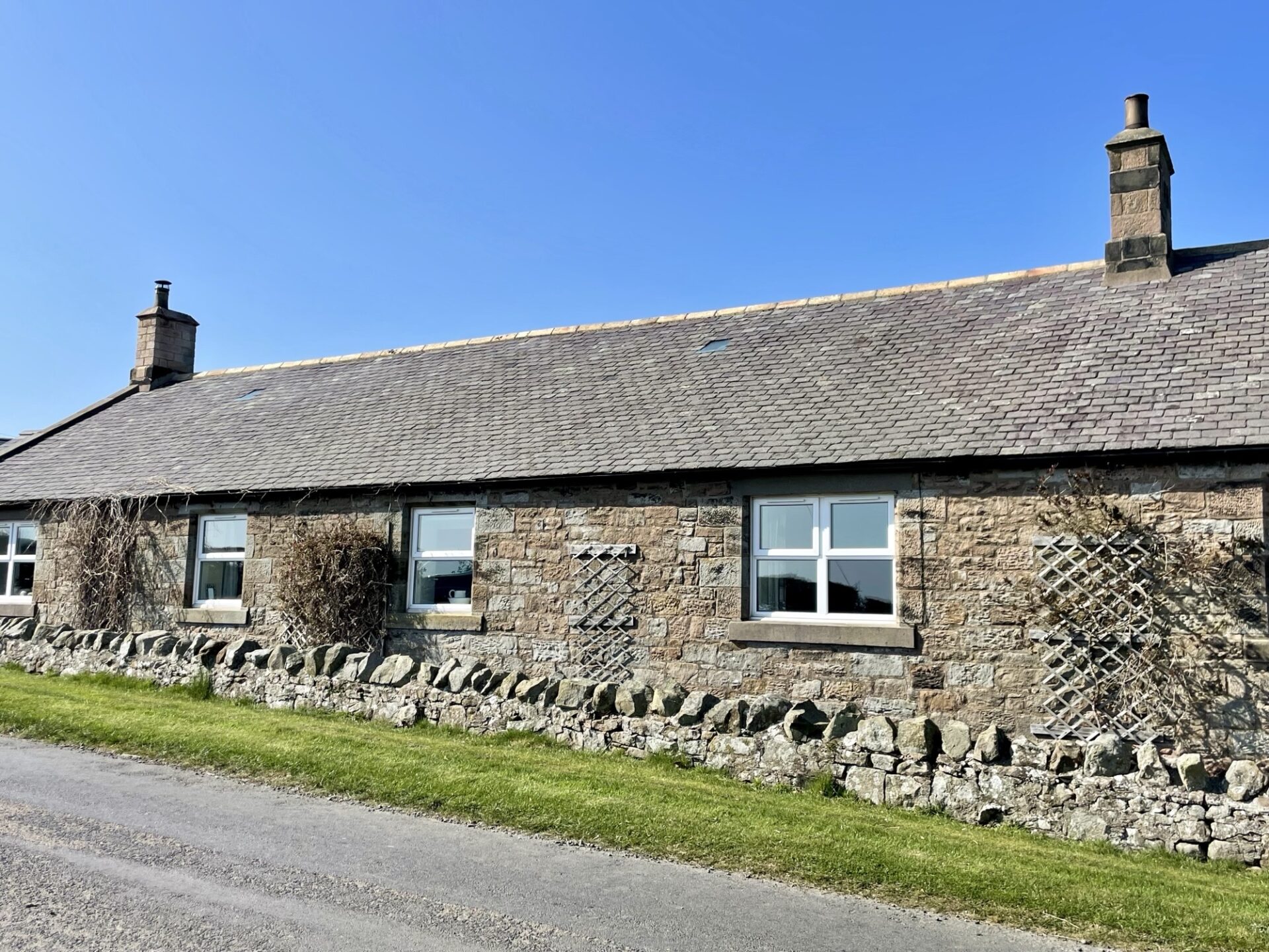 A car is advised due to the rural location. There is private parking with space for two cars adjacent to the cottage. The cottage has its own large enclosed patio area with garden furniture and views over the open countryside – Bamburgh Castle can be seen in the distance.